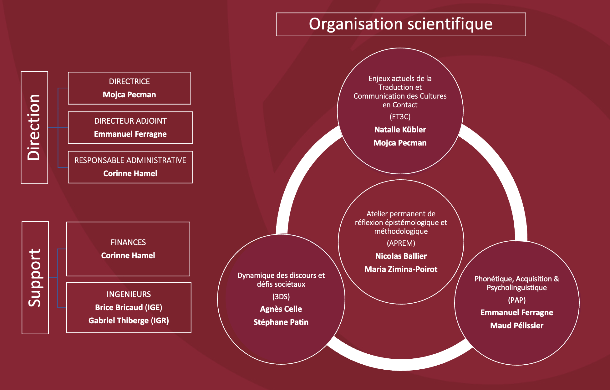 Le laboratoire est dirigé par Mojca Pecman, professeur à l’UFR EILA. Le directeur adjoint est Emmanuel Ferragne, professeur à l’UFR d’Études Anglophones.